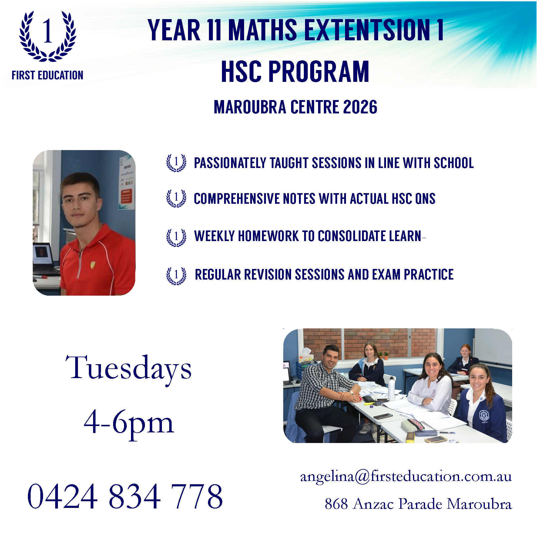 The First Education HSC Chemistry Program is intended for the purpose of guiding HSC students through their HSC Chemistry studies at a slightly faster rate than what they are likely to experience in the classroom. The program combines learning in small groups, interacting individually with the tutor, doing homework, and experiencing exam style conditions to allow each student to build their passion and confidence in their chemistry to conquer their goals!!