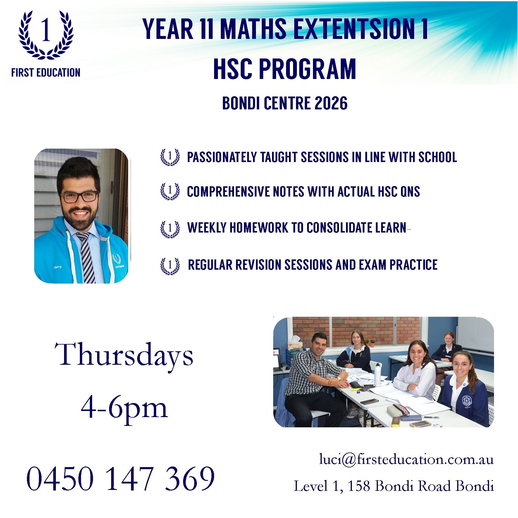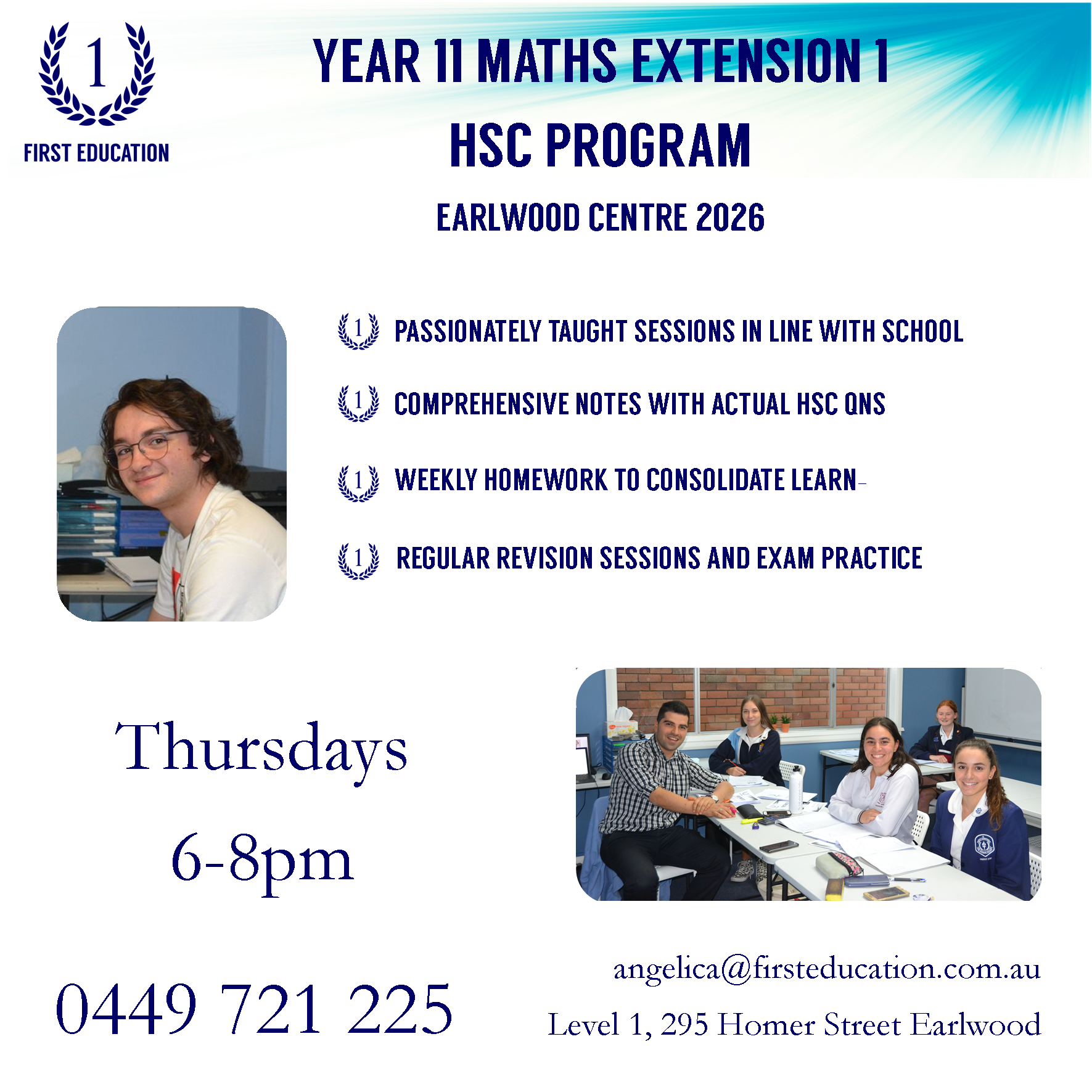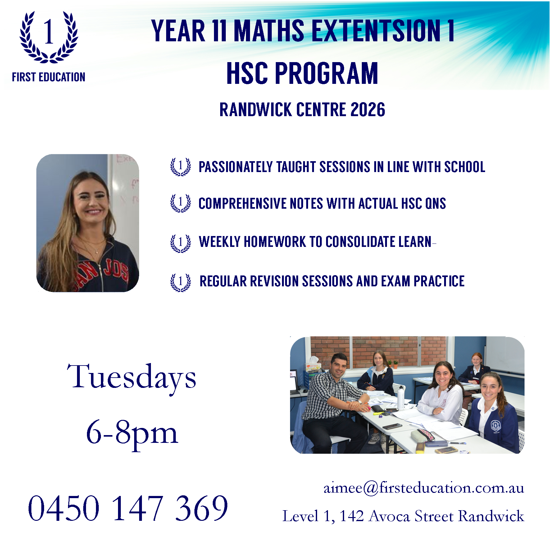 The First Education HSC Mathematics Extension 1 (3 Unit) Program is intended for the purpose of guiding HSC students through their HSC Maths studies at a slightly faster rate than what they are likely to experience in the classroom. The program combines learning in small groups, interacting individually with the tutor, doing homework, and experiencing exam style conditions to allow each student to build their passion and confidence in their maths to conquer their goals!!