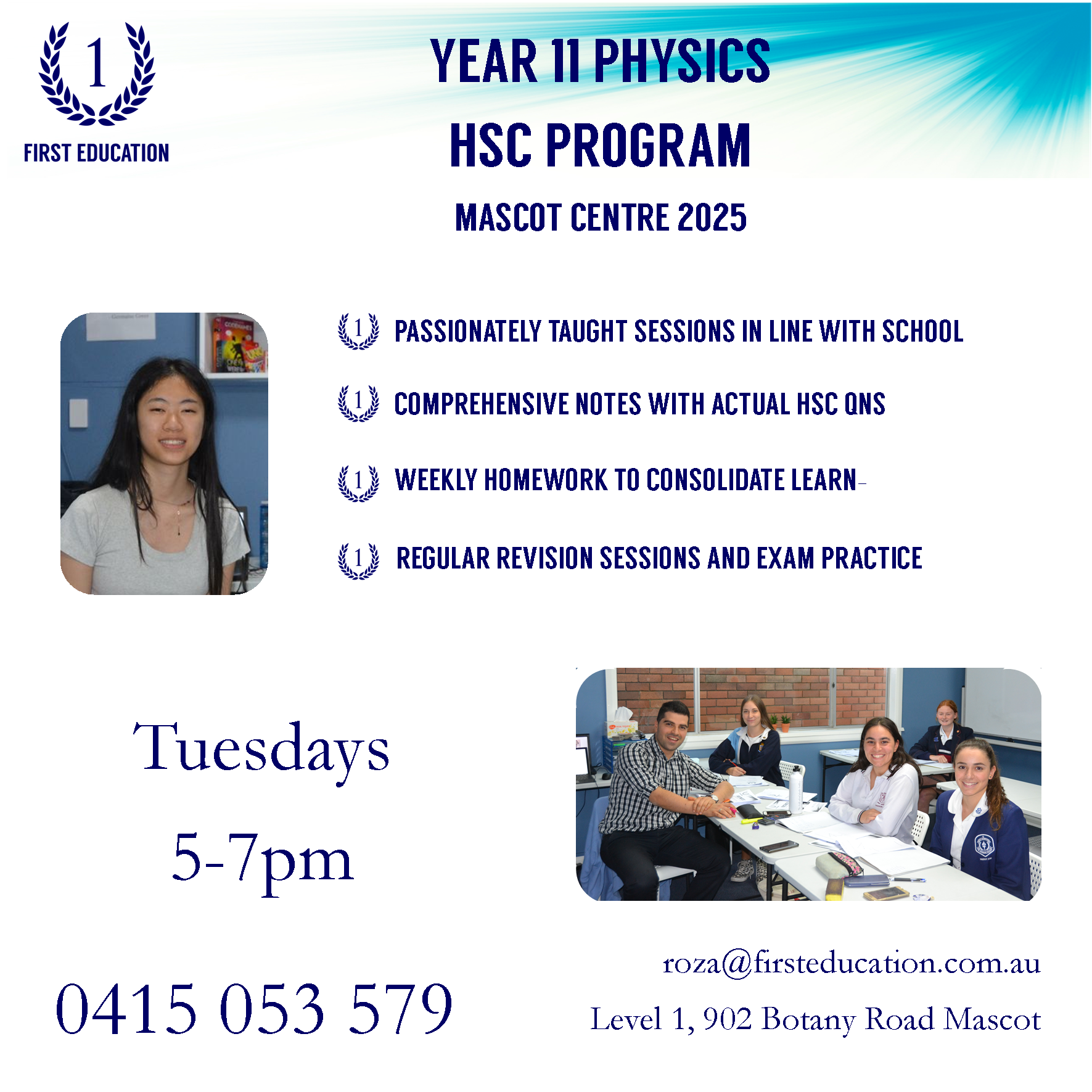 The First Education HSC Physics Program is intended for the purpose of guiding HSC students through their HSC Physics studies at a slightly faster rate than what they are likely to experience in the classroom. The program combines learning in small groups, interacting individually with the tutor, doing homework, and experiencing exam style conditions to allow each student to build their passion and confidence in their physics to conquer their goals!!