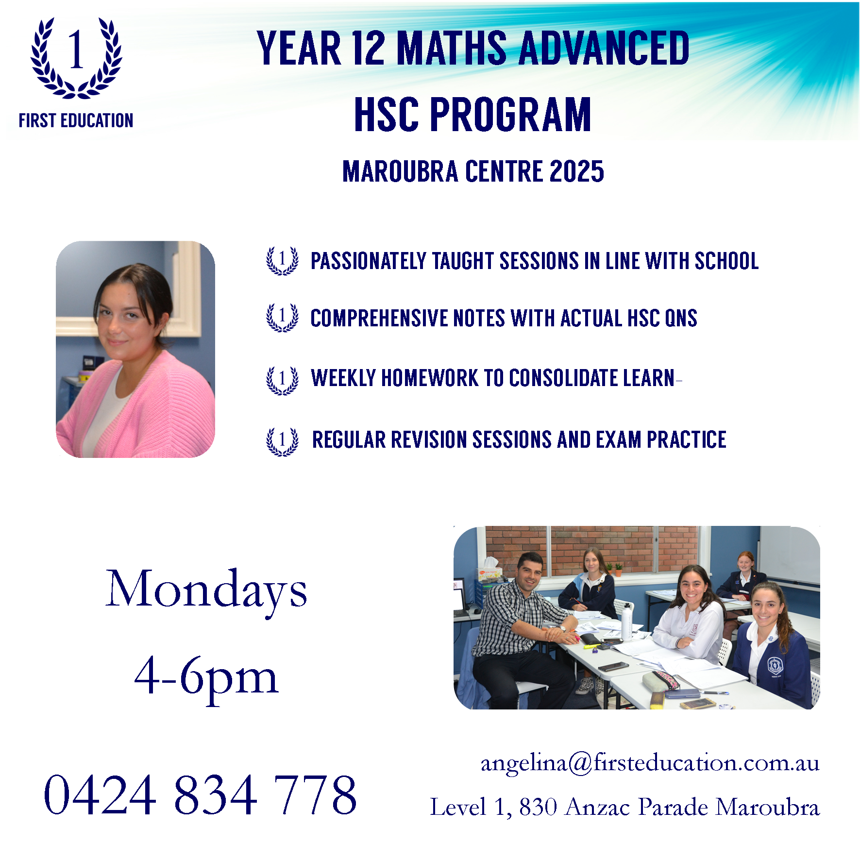 The First Education HSC Mathematics Advanced (2 Unit) Program is intended for the purpose of guiding HSC students through their HSC Maths studies at a slightly faster rate than what they are likely to experience in the classroom. The program combines learning in small groups, interacting individually with the tutor, doing homework, and experiencing exam style conditions to allow each student to build their passion and confidence in their maths to conquer their goals!!