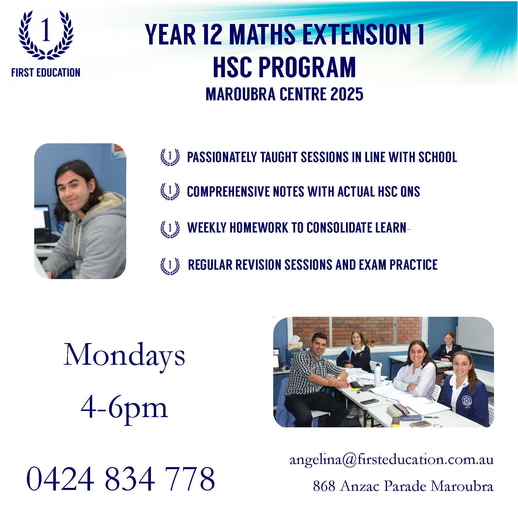 The First Education HSC Mathematics Extension 1 (3 Unit) Program is intended for the purpose of guiding HSC students through their HSC Maths studies at a slightly faster rate than what they are likely to experience in the classroom. The program combines learning in small groups, interacting individually with the tutor, doing homework, and experiencing exam style conditions to allow each student to build their passion and confidence in their maths to conquer their goals!!