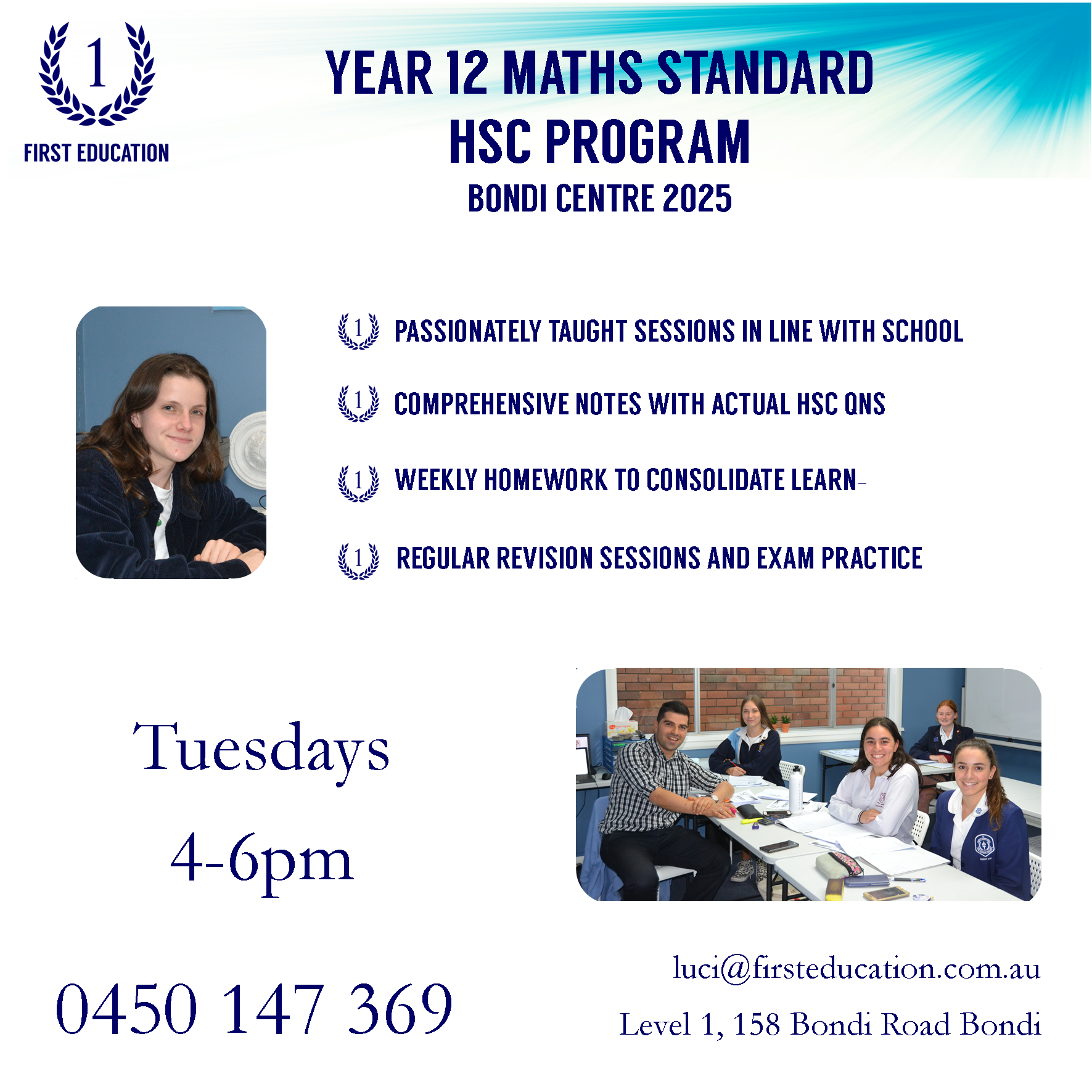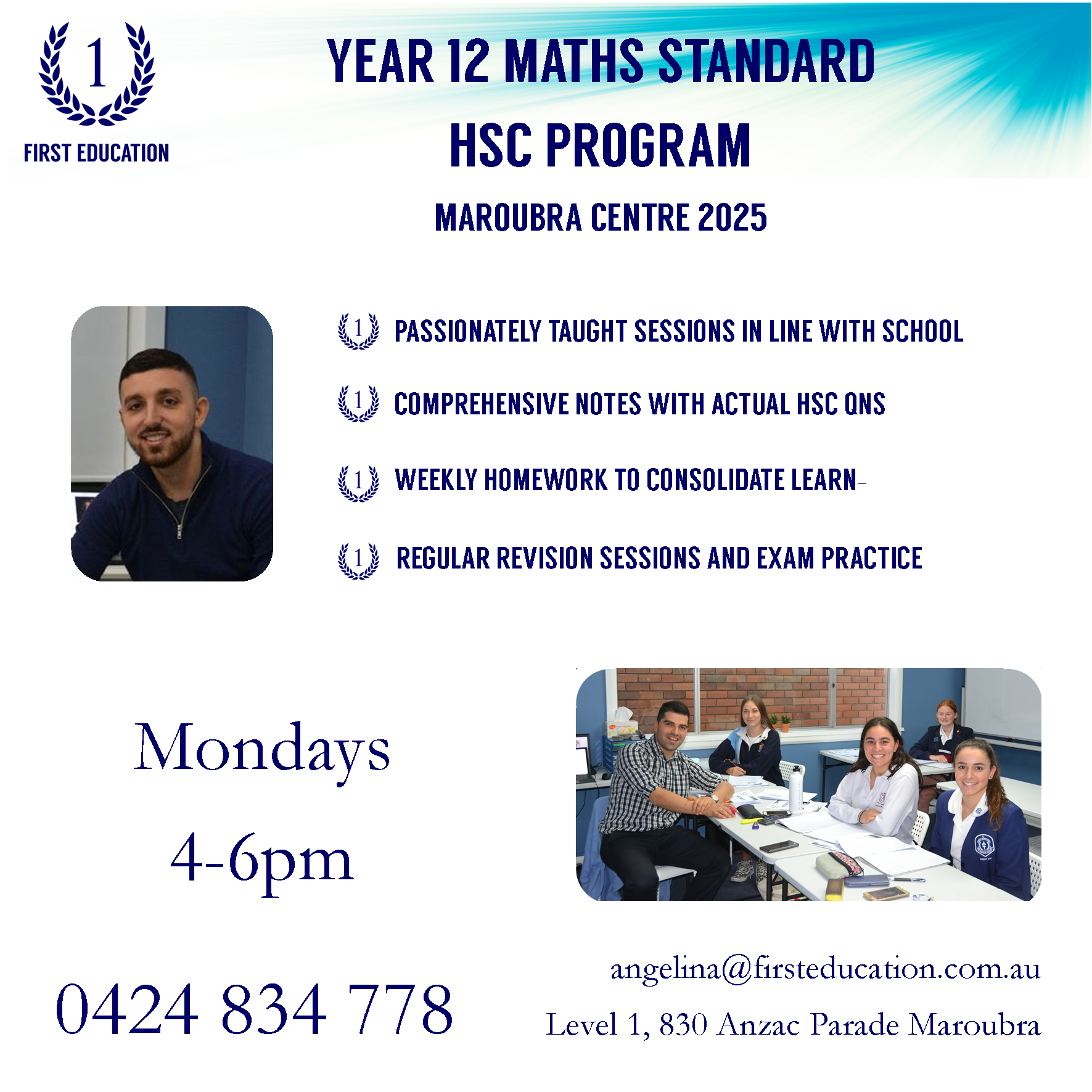 The First Education HSC Mathematics Standard Program is intended for the purpose of guiding HSC students through their HSC Maths studies at a slightly faster rate than what they are likely to experience in the classroom. The program combines learning in small groups, interacting individually with the tutor, doing homework, and experiencing exam style conditions to allow each student to build their passion and confidence in their maths to conquer their goals!!